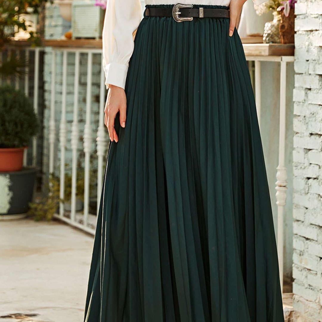 Las faldas plisadas largas nunca pasan de moda, y esta pieza es la prueba perfecta. Con su diseño fluido y cintura alta, estiliza la silueta mientras brinda comodidad y elegancia. Ideal para looks casuales o más formales, ¡se convertirá en tu favorita!